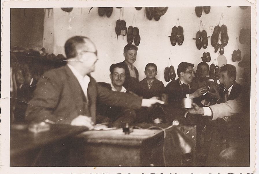 Ο Μιχαλουδομιχάλης με την παρέα του στο τσαγκαράδικό του σε μεγάλες πλάκες στις 24-12-1956 (φωτογραφία από Γιαννη Χατζόπουλο (Γιαννάκη του Μιχαλουδομιχάλη))